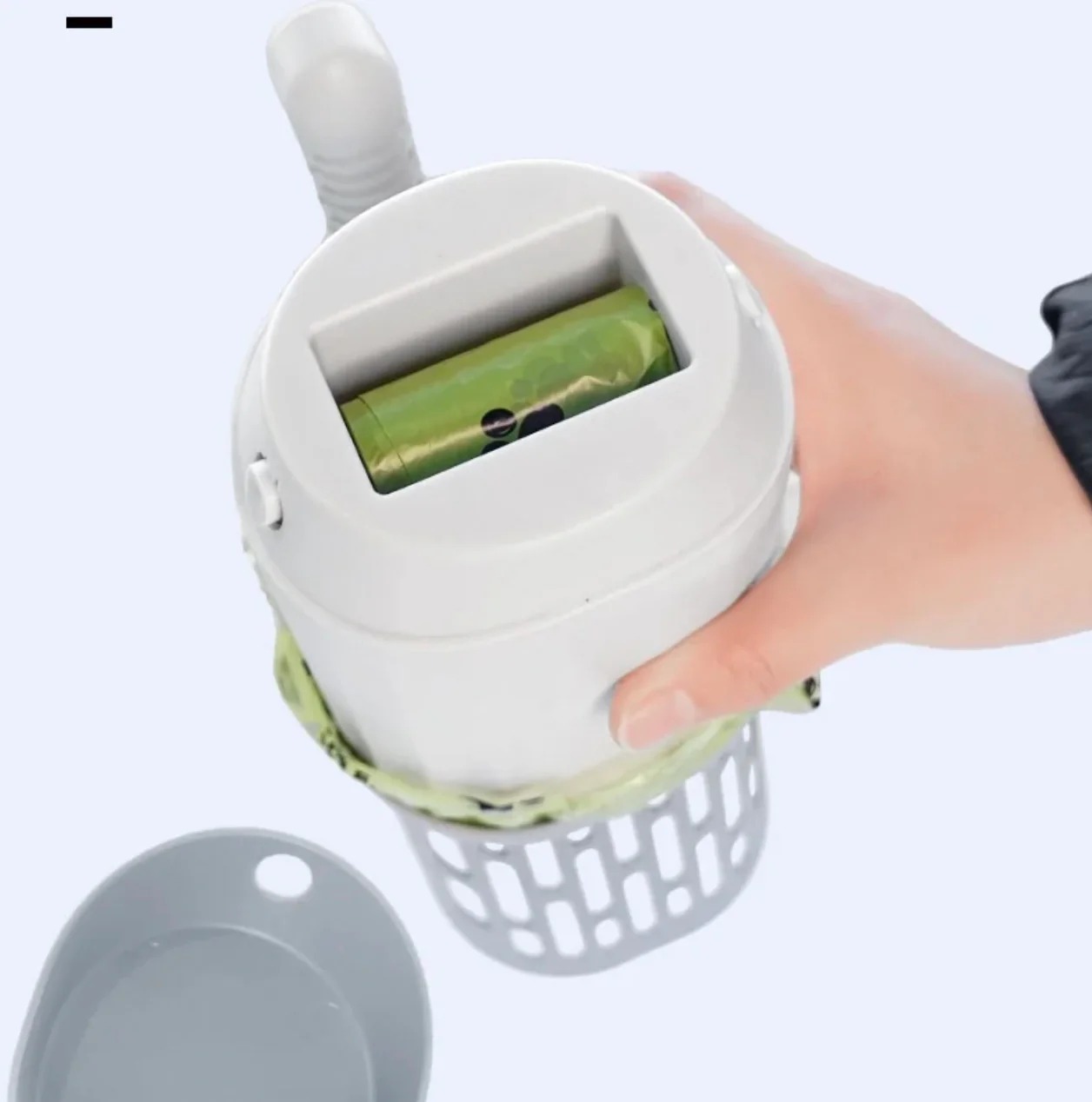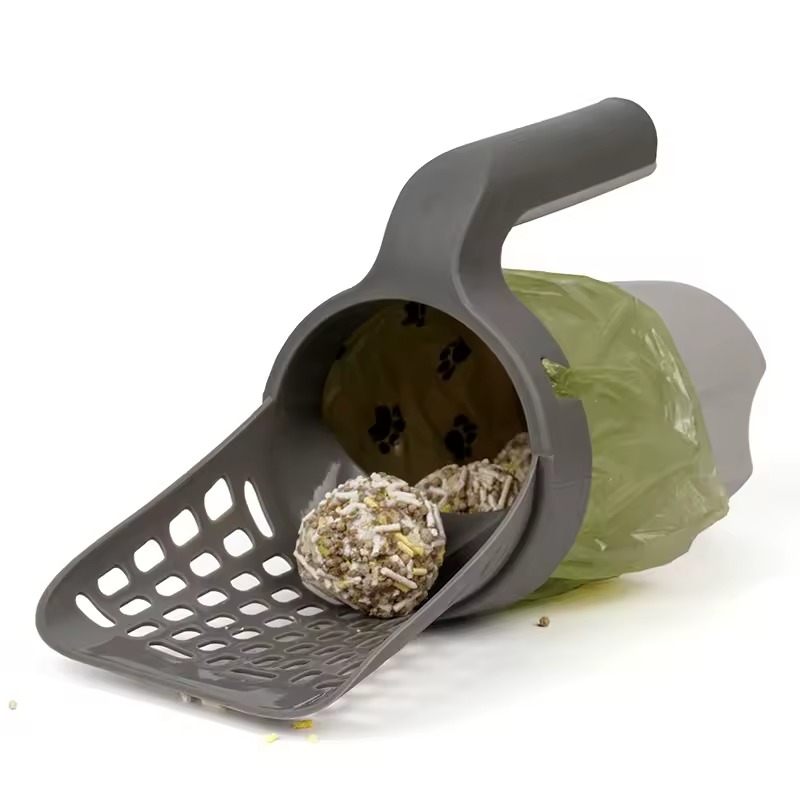 Smart kattesandskyffel med integrerad påsehållare som gör kattlåde-rengöringen snabbare, renare och mer hygienisk.